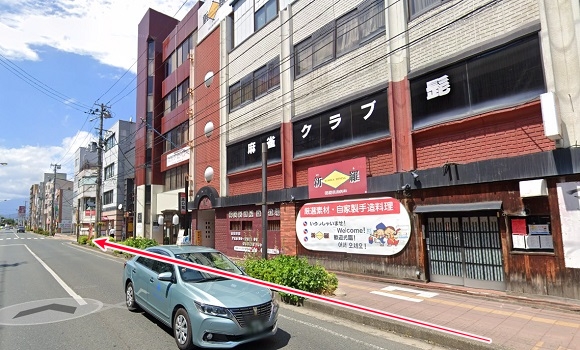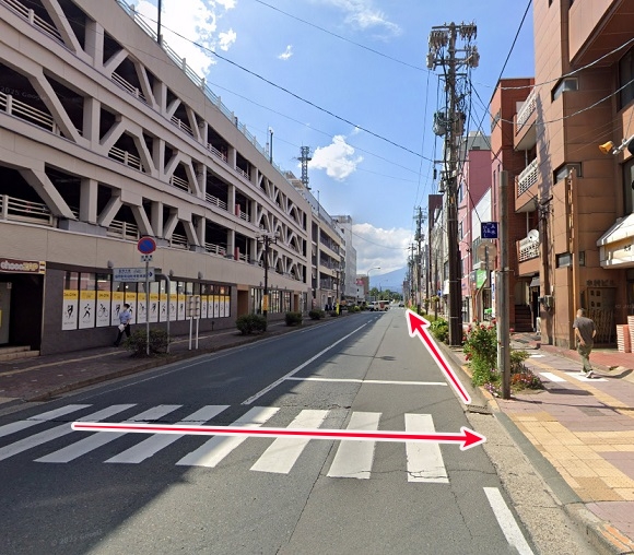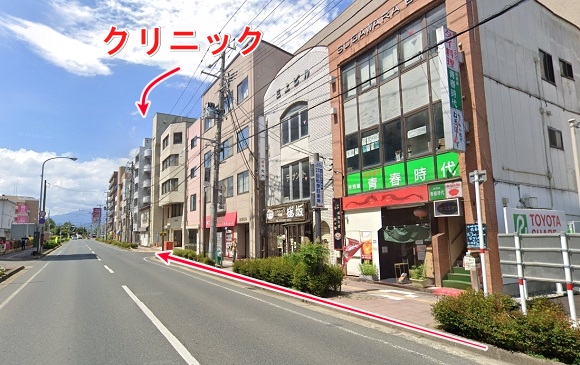 この先に横断歩道はないので、ココで通りの右側へ移動し、左折して進みます。この場所にはコインパーキングがあるので、車で来院する場合は非常に便利です。